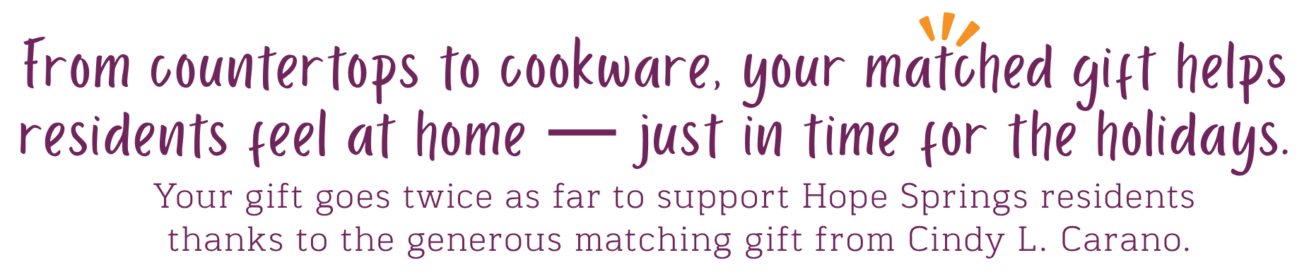Your gift will help us renovate and replenish the kitchen. You’re not just replacing cracked countertops, worn cabinets or stocking shelves with cookware. You’re giving each resident a personalized kitchen basket of utensils and storage containers. You’re helping someone feel at home, perhaps for the first time in a long time.